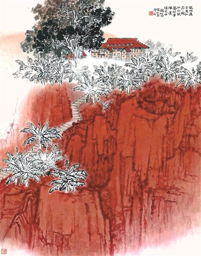 我们看到,最终的定稿,旧址被安置到了画的顶部,画面中大大压缩了标志性建筑的规模,但因为红色的屋顶,与画面主体的红色崖壁形成了鲜明的呼应,并不显得孤立。旧址旁原有的几棵树,被换成泰山的汉柏造型,墨黑色的大树冠罩染上了一层浅朱砂,保持了画面上方色调的统一。为了不影响处于中心位置的红岩,上山小道靠左边绘出,形成一条斜线。以白描手法勾勒出的芭蕉仿佛是旧址的引导员,沿石阶而上。整个画面形成红、黑、白三种颜色,突出了主题寓意。