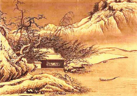 再看看梁简文帝萧纲的咏冬诗,那是通过惨淡的月色衬托出清寒的“内心”:“喧尘是时息,静坐对重峦。冬深柳条落,雪后桂枝残。星明雾色净,天白雁行单。云飞乍想阁,冰结远疑纨。晚橘隐重屏,枯藤带回竿。荻阴连水气,山峰添月寒。”诗的首句“喧尘是时息”,不是因为尘喧已静方来独坐,而是因为独坐忘机,才尘喧顿息,留了无限的余地给下文。“静坐对重峦”仿佛一架五彩屏风即将展开,初冬萧条冷落的景致被勾勒出来。“冬深柳条落,雪后桂枝残”透出一重幽冷之意,而明星、银河辉映之下,一行鸿雁孤单地南飞而去,增添了景物的幽谧。“云飞乍想阁,冰结远疑纨”则由赏景沉入遐思:当天边升起参差的暗云时,仿佛海市一般,令人想起那是变幻不定的重楼叠阁;远处河塘凝结的薄冰,又叫人疑心那是铺展开的一袭洁白纨素,运用这种方式,巧妙地传达了诗人的主观感受。但收目俯临宫苑近处,景物便不同了,此刻吸引他目光的是夜色中的“晚橘”,在重重墙垣间,时可见到暗绿的树影,那是屈原赞美过的南国之橘,即便在冬天,仍保持着“苏世独立”的苍青之色。由此引出结句“山峰添月寒”,重峦叠嶂的峰影,仿佛因惨淡的月色而更加清寒。